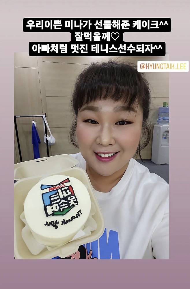 김민경은 지난 26일 자신의 인스타그램 스토리에 "우리 이쁜 미나가 선물해 준 케이크..잘 먹을게. 아빠처럼 멋진 테니스 선수 되자^^"라는 글과 케이크 인증 사진으로 근황을 전했다.