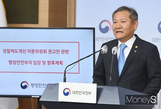 이상민 행정안전부 장관이 27일 오전 서울 종로구 정부서울청사 별관에서 '경찰제도 개선자문위원회' 권고안에 대한 행안부의 입장 발표를 하고 있다.