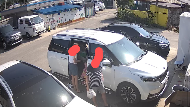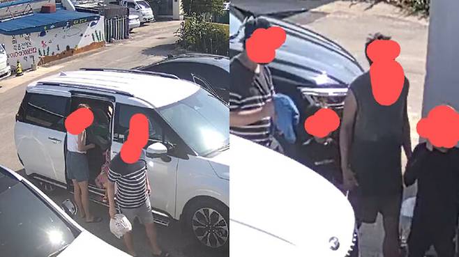 A 씨가 공개한 CCTV 화면 속에는 흰색 카니발 차량과 함께 일가족으로 보이는 무리가 포착됐습니다.