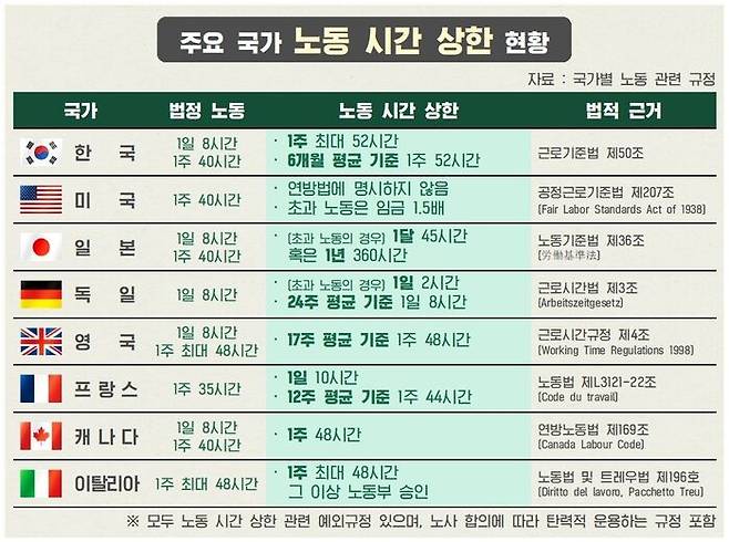 사실 노동 시간을 규정하고 있는 법령은 보통 '큰 원칙'을 제시할 뿐 예외 조항도 여럿 있고, 특히 노사가 알아서 정해 탄력적으로 운영할 수 있도록 여지를 남기는 부분도 많습니다. 위 표는 각국 산업 현장에서 공식처럼 무조건 적용되는 건 아님을 강조합니다.