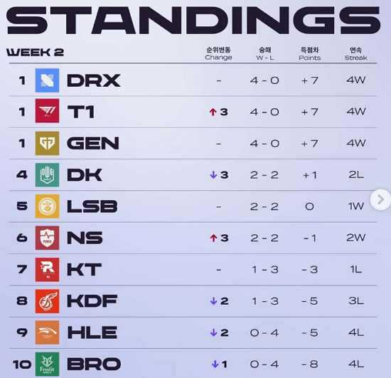 자세한 순위표를 살펴보면 1위는 3팀이 기록 중이다. DRX, T1, 젠지가 4승 0패 득실차 +7로 공동 1위에 이름을 올렸다. 아직까지 무패행진을 달리고 있어 눈길을 사로잡았다. 특히 T1의 경우 4위에서 1위까지 3계단 상승을 이뤄냈다.