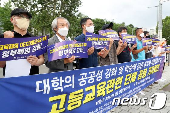 (서울=뉴스1) 황기선 기자 = 전국교수노동조합 등 고등교육관련 단체가 27일 오전 서울 용산 대통령 집무실 앞에서 기자회견을 열고 대학의 공공성강화 및 박순애 사회부총리 겸 교육부장관 후보자 지명철회를 요구하고 있다. 2022.6.27/뉴스1
