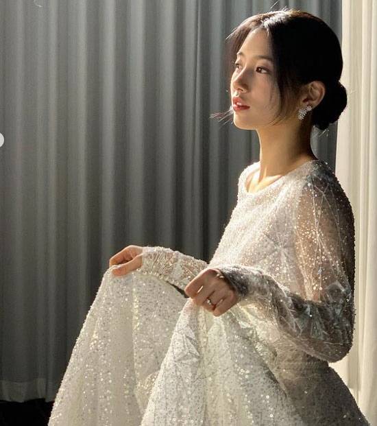 공개한 사진에는 화려한 장식이 돋보이는 웨딩드레스를 입은 수지의 모습이 담겼다.
