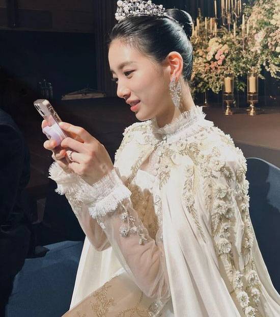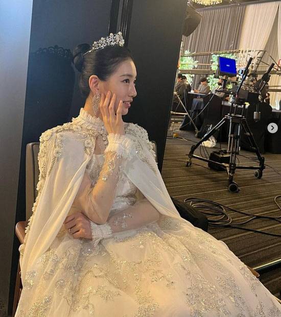배우 수지가 웨딩 드레스 자태를 공개했다.