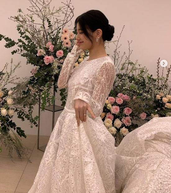 공개한 사진에는 화려한 장식이 돋보이는 웨딩드레스를 입은 수지의 모습이 담겼다. 우아한 아름다움을 빛나게 만드는 드레스 자태가 시선을 사로 잡는다.
