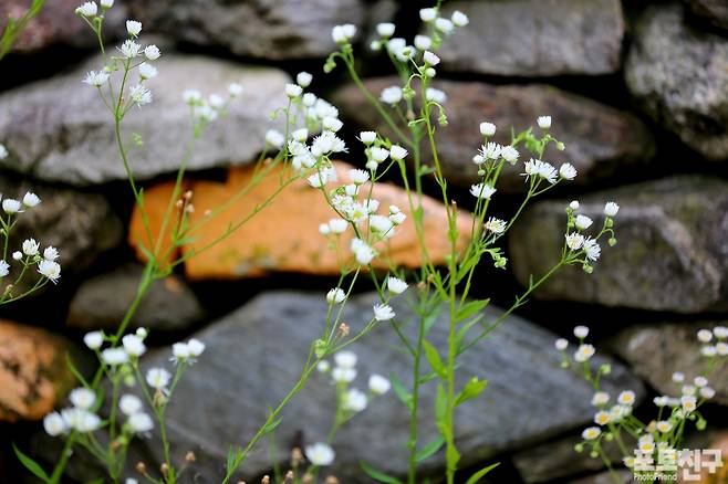 노란 돌담에 핀 개망초