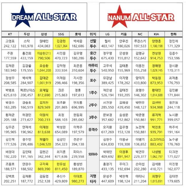 나눔 올스타에서 KIA는 외야수 한 자리를 제외한 11개 포지션에서 소속 선수들이 3주 연속 선두를 달리고 있다. 이번 중간집계 결과가 최종까지 이어진다면, KIA는 2013년 LG와 2021년 삼성에 이어 역대 최다 베스트12 배출 구단 타이기록을 달성하게 된다.