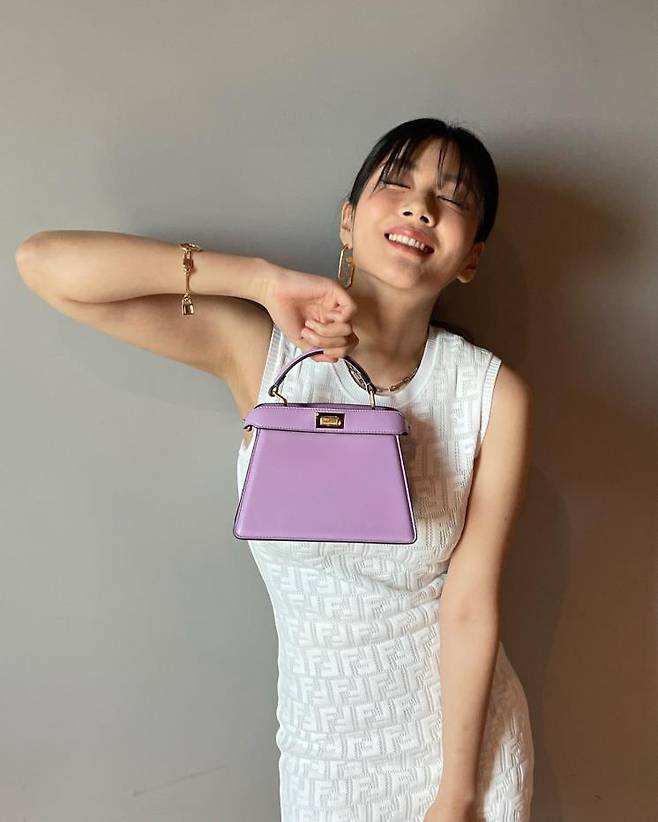 늘씬한 몸매가 그대로 드러나는 화이트 보디컨셔스 원피스를 입은 비비는 상큼한 라일락 컬러의 피카부 백을 들었다. 여기에 FF 로고 모티브의 볼드한 골드 주얼리 함께 매치하니 단숨에 드레스업!