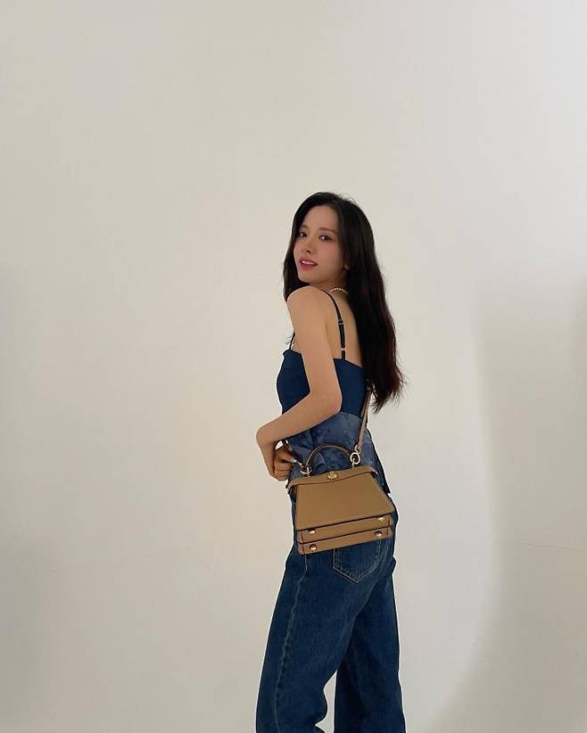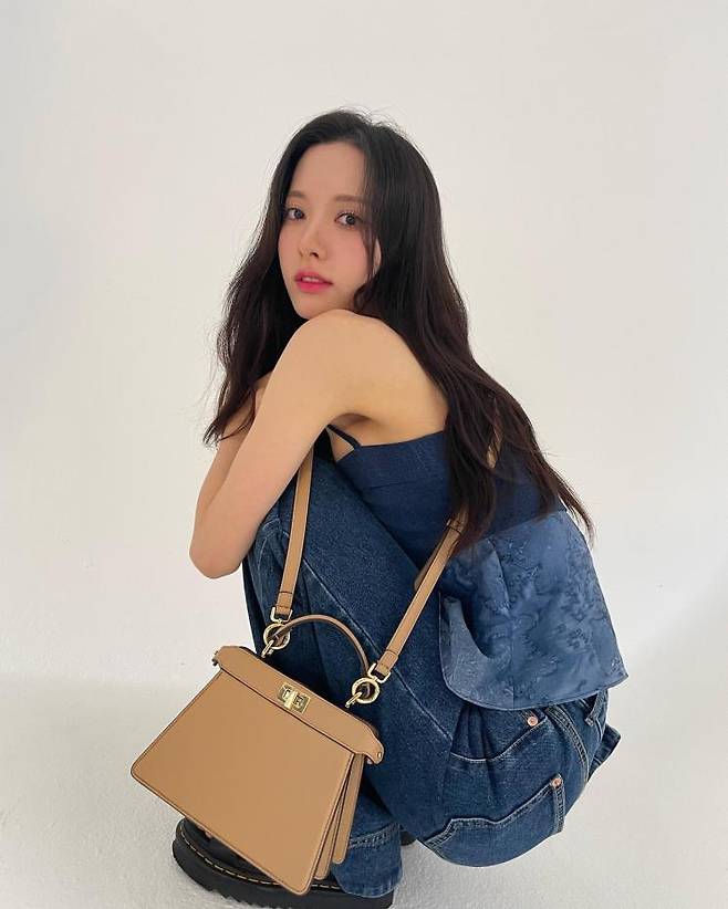핫 서머 시즌에 착붙인 블루 데님 룩과 브라운 컬러의 피카부 아이씨유 백을 매치한 우주소녀 보나. 쿨한 캐주얼 무드를 강조하는 동시에 피카부 특유의 우아한 분위기가 어우러져 더욱 매력적이다.