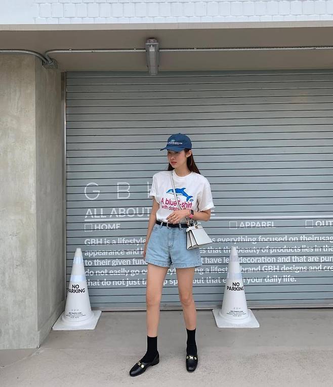 감각 있는 사복 패션으로 유명한 배우 차정원. 돌고래 프린트 티셔츠와 데님 쇼츠 차림의 캐주얼 룩에 정반대 무드의 화이트 피카부 아이씨유 백과 블랙 로퍼로 고급스럽고 단정한 분위기를 더했다.