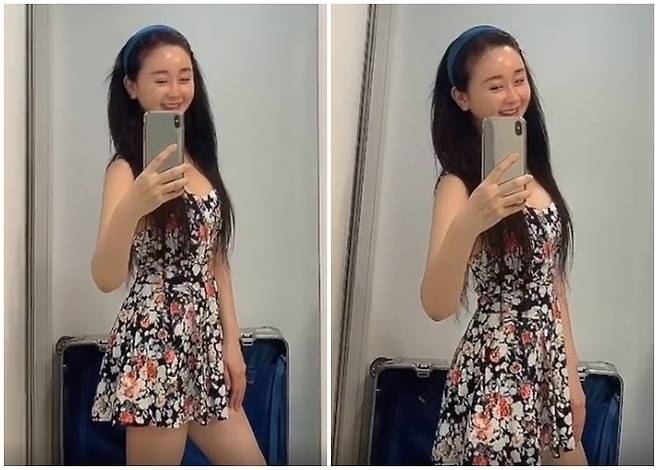 거울을 향해 영상을 찍으며 군살 없이 늘씬한 몸매를 자랑해 감탄을 자아냈다.