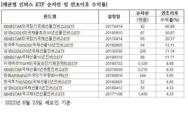 채권 인버스 ETF는 국채선물에 숏 포지션을 구축해 금리가 상승하는 국면에 수익을 내도록 설계된 상품이다. 제로인에 따르면 'KBSTAR미국장기국채선물인버스2X ETF'는 연초 이후 23일까지 40.86% 수익률을 기록했다. 'KODEX미국채울트라30년선물인버스 ETF'의 수익률이 30.87%로 뒤를 이었다.