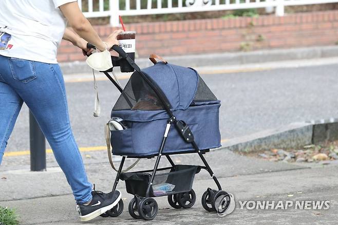 사진은 27일 서울의 한 공원에서 반려동물 유모차를 끄는 시민. 2022.6.27
