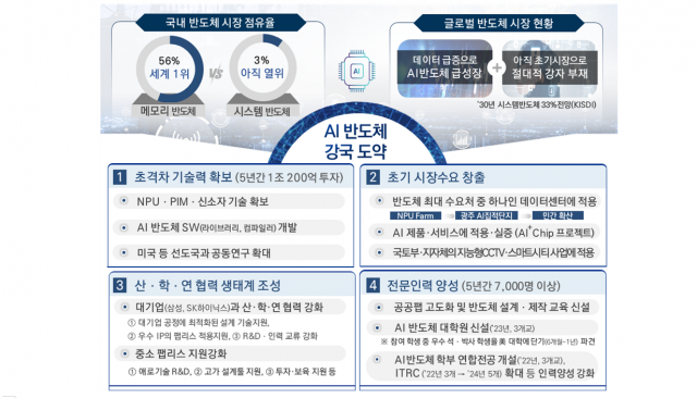 반도체는 최근 경제적 가치뿐만 아니라 국가 안보상 필수 자산으로 중요성이 강조되며 글로벌 기술패권 경쟁의 중심에 위치하고 있다. 이에 미국 등 주요 선진국들은 반도체 등 첨단기술 개발에 막다한 자금 투입은 물론 반도체 산업육성 및 세제지원에도 적극 나서고 있다. 반면 한국은 메모리반도체 점유율은 세계 1위(점유율 56%)이나 메모리 시장의 2배 이상인 시스템반도체(점유율 3%) 경쟁력은 부족하다는 지적이 나오고 있다. 특히 AI의 전 산업 확산 및 데이터 처리량 증가로 시스템반도체 시장에서 AI 반도체 비중이 급성장하는 가운데 AI 반도체 시장 선점 위한 전략적 육성이 필요하다는 판단에 따라 이번 지원대책이 마련됐다고 과기정통부는 설명했다.