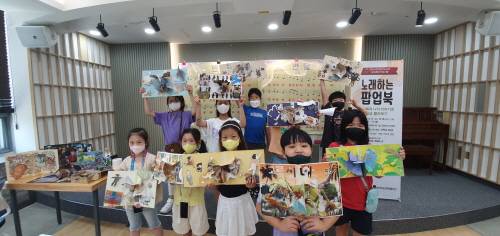 한국근현대음악관에서는 초등학생들과 재활용되지 않는 코팅된 그림책을 자르고 찢고 붙여서 자기만의 팝업 그림책을 만들었다.