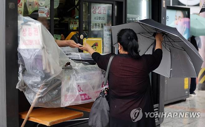 (서울=연합뉴스) 김인철 기자 = 이번 주 내내 장맛비가 내릴 것으로 예보된 27일 오후 서울 시내의 한 가로가판대에서 시민이 우산을 구입한 뒤 거스름돈을 돌려받고 있다. 2022.6.27