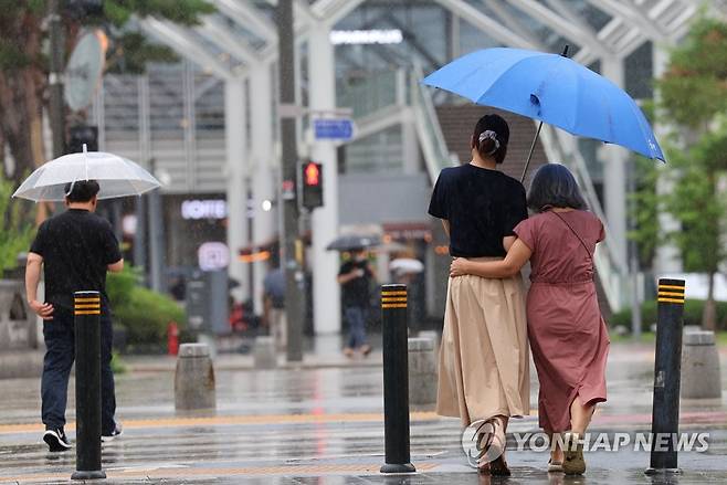 (서울=연합뉴스) 김인철 기자 = 이번 주 내내 장맛비가 내릴 것으로 예보된 27일 오후 서울 시내의 거리에 비가 내리고 있다. 2022.6.27
