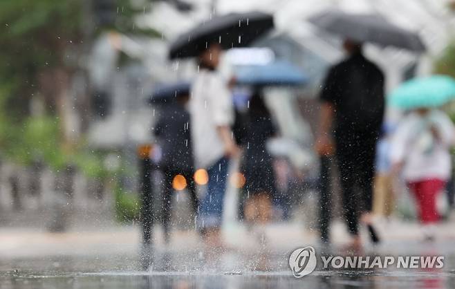 (서울=연합뉴스) 김인철 기자 = 이번 주 내내 장맛비가 내릴 것으로 예보된 27일 오후 서울 시내의 거리에 비가 내리고 있다. 2022.6.27