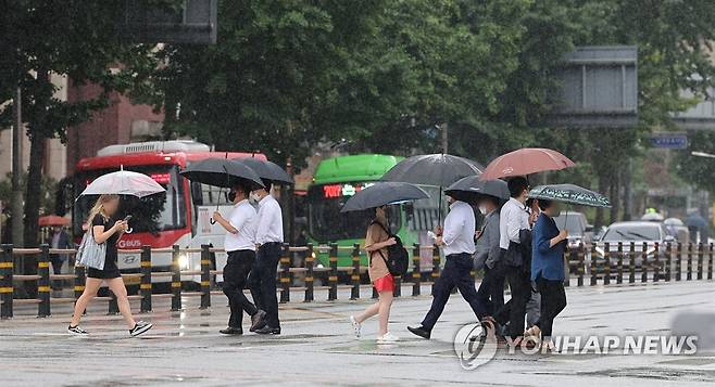 (서울=연합뉴스) 김인철 기자 = 이번 주 내내 장맛비가 내릴 것으로 예보된 27일 오후 서울 시내의 거리에 비가 내리고 있다. 2022.6.27