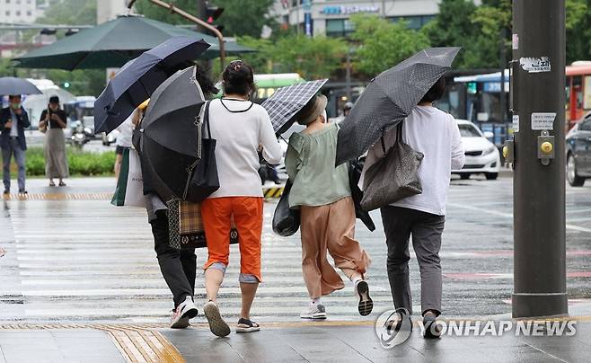 (서울=연합뉴스) 김인철 기자 = 이번 주 내내 장맛비가 내릴 것으로 예보된 27일 오후 서울 시내의 거리에 비가 내리고 있다. 2022.6.27