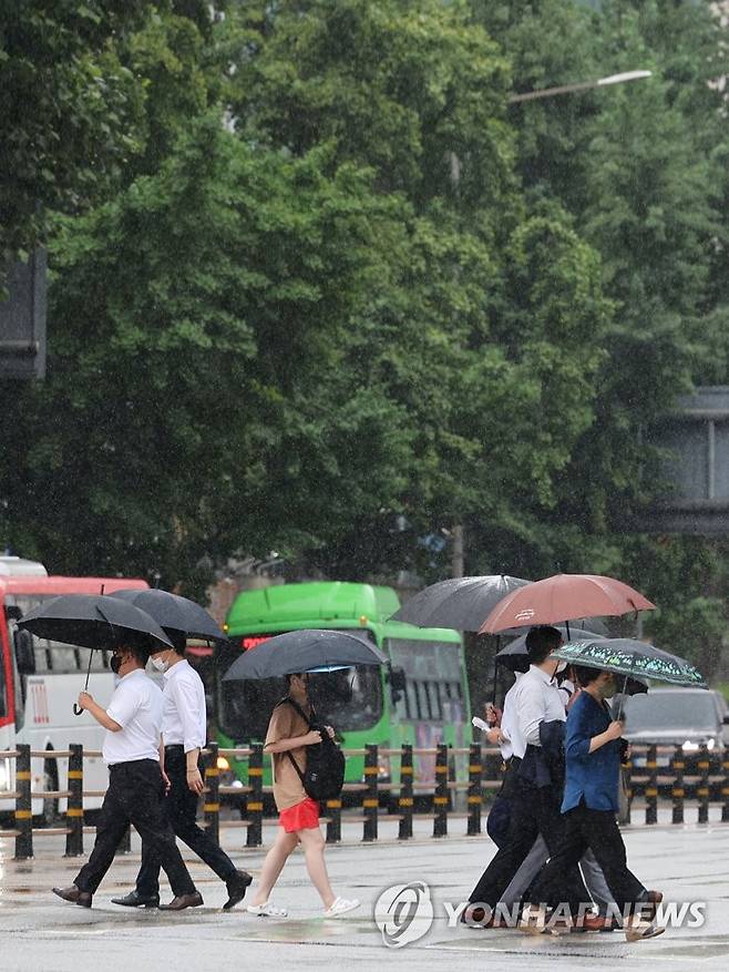 (서울=연합뉴스) 김인철 기자 = 이번 주 내내 장맛비가 내릴 것으로 예보된 27일 오후 서울 시내의 거리에 비가 내리고 있다. 2022.6.27