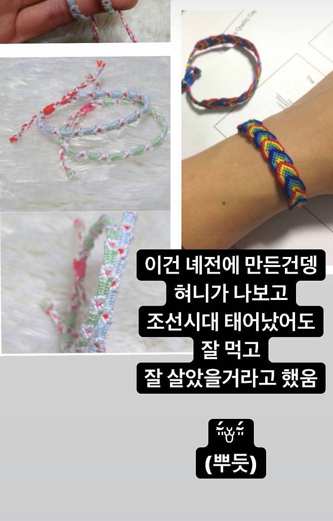 사진에는 제이쓴이 늦은 밤까지 공들여 만든 실팔찌가 담겨있다. 이어 제이쓴은 이전에 만들었던 알록달록한 색상의 무지개 모양, 꽃 모양 실팔찌를 공개했다. 제이쓴의 금손 솜씨가 놀라움을 자아내게 한다. 그는 "이건 예전에 만든건뎅 혀니가 나보고 조선시대 태어났어도 잘 먹고 잘 살았을 거라고 했움 (뿌듯)"이라며 자랑글을 덧붙였다.