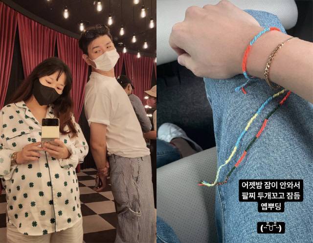 제이쓴은 27일 자신의 인스타그램 스토리에 "어젯밤 잠이 안와서 팔찌 두 개 꼬고 잠듦. 예뿌딩"라는 글과 함께 사진을 게재했다.