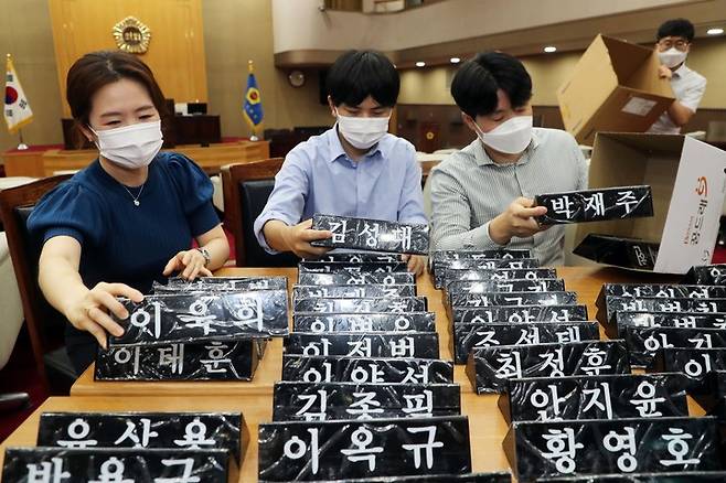 [청주=뉴시스] 천영준 기자 = 제12대 충북도의회 개원을 앞둔 27일 도의회 사무처 직원들이 본회의장에서 당선자들의 명패를 정리하며 분주하게 움직이고 있다. (사진=충북도의회 제공) 2022.06.27.