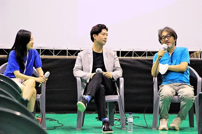 | ▲ 26일 대관령트레이닝센터에서 열린 2022 평창국제평화영화제의 <오늘 출가합니다> 관객과의 대화(GV)에서 (왼쪽부터) 이화정 기자, 나현준 배우, 김성환 감독이 GV를 진행하고 있다. |