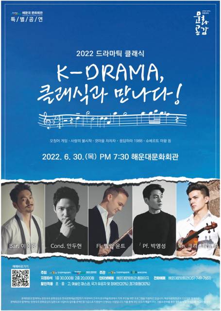 해운대문화회관(관장 서영지)이 30일 저녁 7시 30분 해운대문화회관 해운홀에서 보다 쉽게 클래식을 접할 수 있는 드라마틱 클래식 ‘K-DRAMA, 클래식과 만나다’를 개최한다.