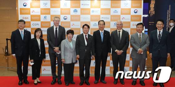 (성남=뉴스1) 김영운 기자 = 27일 오후 경기 성남시 분당구 SK에코허브에서 열린 SK바이오사이언스 글로벌포럼에서 한덕수 국무총리, 최창원 SK디스커버리 부회장, 안철수 국민의힘 의원 및 참석자들이 기념촬영을 하고 있다. 2022.6.27/뉴스1