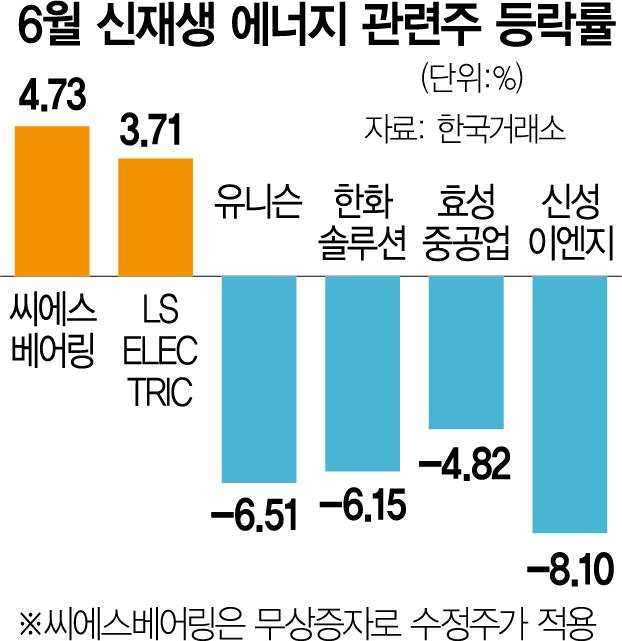 6월 국내 증시의 낙폭이 두드러진 가운데 신재생에너지 관련 종목들이 우수한 방어력을 보인 것으로 나타났다.