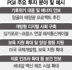 조 바이든 미 대통령이 직접 밝힌 이번 파트너십에는 △아프리카 세네갈 백신 제조 시설 확대 △앙골라 태양광에너지발전소 건설 △루마니아 소형모듈원전(SMR) 배치 △동남아~중동~서유럽 해저 통신 케이블 구축 등 이미 추진 중인 프로젝트들이 다수 포함된다.