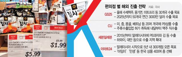 국내 편의점이 당초 해외로 눈을 돌린 이유는 안정적인 수익 창출 기반 마련을 위해서였다. 국내에서는 근접 출점 제한 등으로 신규 점포를 내기가 쉽지 않을 뿐 더러 이커머스 업체들의 폭발적 성장도 위협적이었다. 이에 GS25는 수제맥주, 용기면, 수출 전용 만두 등 자체상표(PB) 상품들의 해외 판로를 넓히기 시작했다. 지난 2019년 아시아 지역 14개국을 시작으로 영국, 캐나다, 호주 등 서방 국가로 수출국을 확대해 30개국 이상까지 늘렸다.