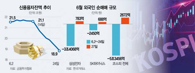 그간 국내 증시의 낙폭을 키우던 반대매매가 정점을 지나면서 증시 하방 압력이 완화될 것이라는 분석이 나온다. 6월 한국 증시가 다른 나라보다 낙폭이 컸던 배경으로 반대매매가 지목돼왔는데 일정 부분이 청산되면서 부담이 줄어들 것이라는 분석이다. 금융투자협회에 따르면 24일 기준 신용융자잔액은 18조 8919억 원까지 줄어들었다. 9일 이후 약 2조 8000억 원이 줄었다. 신용융자잔액이 18조 원대를 나타낸 것은 2020년 12월 11일 이후 처음이다. 허재환 유진투자증권(001200) 연구원은 “기준금리와 시가총액 대비 신용잔액 비중 간에 역의 관계가 뚜렷한데, 기준금리는 코로나19 이전 수준으로 돌아왔지만 신용잔액 비율은 코로나19에 비해 높다”고 말했다. 그는 “신용잔액 부담이 해소되면 주식시장에는 호재”라며 “현재 상황에서는 3조 원 정도만 감소해도 주식시장에 대한 부담은 크게 완화할 것”이라고 예상했다.