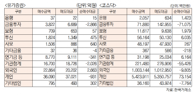 [표]유가증권·코스닥 투자주체별 매매동향(6월 27일-최종치)