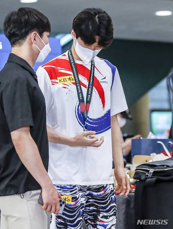 [인천공항=뉴시스] 정병혁 기자 = 2022 국제수영연맹(FINA) 부다페스트 세계선수권대회 자유형 200m에서 은메달과 한국신기록 5개라는 성적을 낸 수영선수 황선우가 27일 오후 인천국제공항 제1터미널을 통해 입국해 취재진의 질의응답 전 메달을 바라보고 있다. 2022.06.27. jhope@newsis.com
