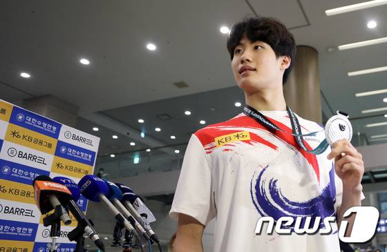 (인천공항=뉴스1) 이동해 기자 = 2022 국제수영연맹(FINA) 세계선수권대회 자유형 200m 은메달리스트 황선우가 27일 오후 인천국제공항 1터미널을 통해 귀국, 인터뷰를 마친 뒤 기념사진을 찍고 있다. 2022.6.27/뉴스1