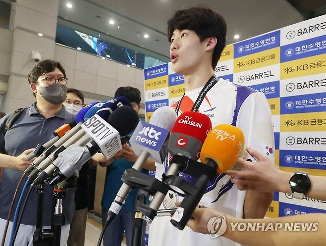(영종도=연합뉴스) 서대연 수습기자 = 세계수영선수권 대회에서 은메달을 획득한 황선우 선수가 27일 인천국제공항 제1여객터미널로 귀국하며 취재진 질문에 답하고 있다.
