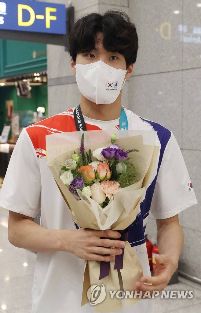 세계수영선수권 대회에서 은메달을 획득한 황선우 선수가 27일 인천국제공항 제1여객터미널로 귀국하며 받은 꽃다발을 손에 들고 걷고 있다.