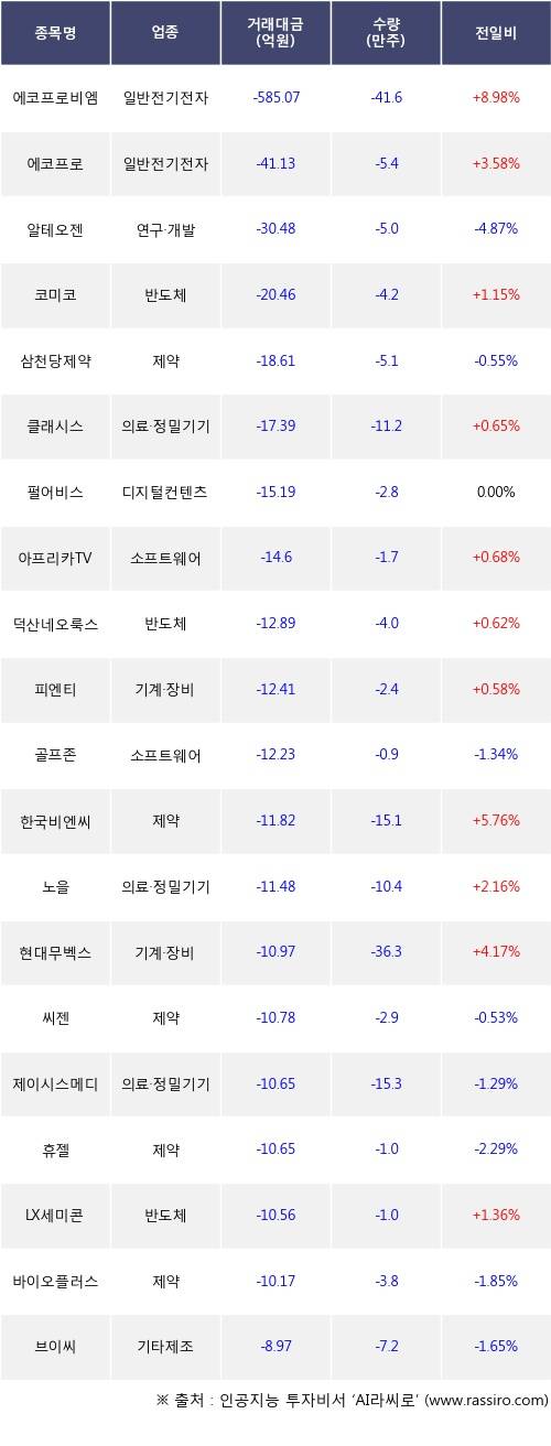 기관 투자자의 순매도 상위 20개 종목은 에코프로비엠, 에코프로, 알테오젠, 코미코, 삼천당제약, 클래시스, 펄어비스, 아프리카TV, 덕산네오룩스, 피엔티등이다.