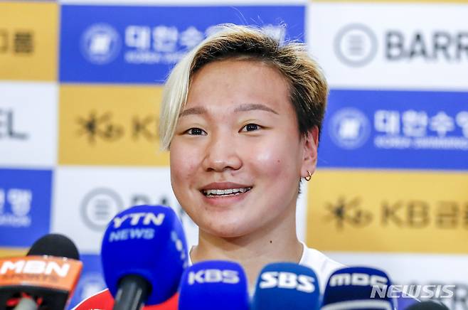 [인천공항=뉴시스] 정병혁 기자 = 2022 국제수영연맹(FINA) 부다페스트 세계선수권대회 대한민 이은지 선수가 이정훈 감독이 27일 오후 인천국제공항 제1터미널을 통해 입국해 취재진의 질문에 답하고 있다. 2022.06.27. jhope@newsis.com