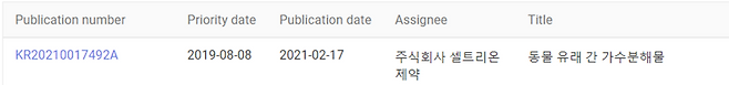 ‘항동성간장엑스’는 소의 간에서 추출하는 물질로, 셀트리온제약이 이에 대한 제조방법을 ‘동물유래 간 가수분해물‘이라는 이름으로 2019년에 신규특허를 냈습니다.