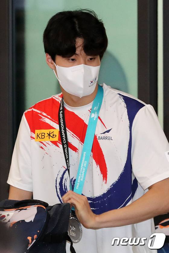 (인천공항=뉴스1) 이동해 기자 = 2022 국제수영연맹(FINA) 세계선수권대회 자유형 200m 은메달리스트 황선우가 27일 오후 인천국제공항 1터미널을 통해 귀국하고 있다. 2022.6.27/뉴스1