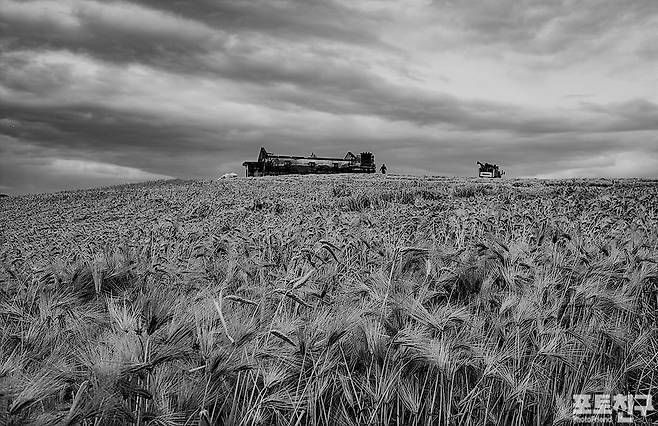 보리밭 언덕의 추수 전후 사진입니다.
