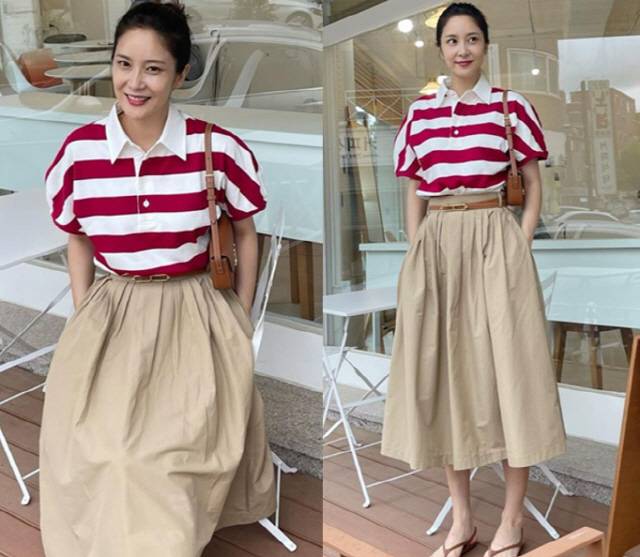 스프라이트 셔츠에 베이지색 치마를 입은 장가현은 올해 46세라는 사실이 믿기지 않을 정도로 동안 미모를 자랑해 감탄을 자아낸다.