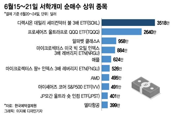 서학개미들은 이 기간 동안 ICE 반도체 지수의 하루 수익률을 3배 따르는 디렉시온 데일리 세미컨덕터 불 3배 ETF(SOXL)를 가장 많은 3518만달러 순매수했다.