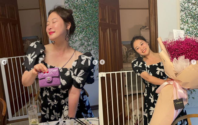 사진 속 심진화는 생일을 맞아 C사 미니백이나 몸집만한 꽃다발을 선물로 받고 기쁨을 숨기지 못하는 모습이다.