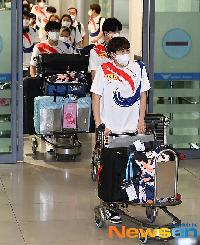 2022 국제수영연맹(FINA) 세계선수권대회(세계수영선수권대회)에 출전한 대표팀이 6월 27일 오후 인천광역시 중구 운서동 인천국제공항을 통해 입국하고 있다.