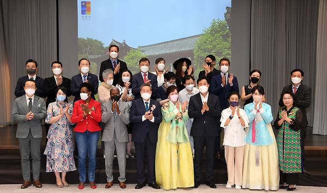 [서울=뉴시스] 조성우 기자 = 오세훈 서울시장이 27일 오후 서울 성북구 삼청각에서 열린 삼청각 개관식에서 참석자들과 기념촬영을 하고 있다. (사진=서울시 제공) 2022.06.27. photo@newsis.com *재판매 및 DB 금지